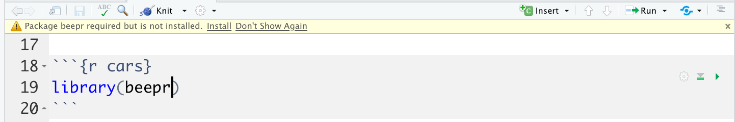 If you save your file and using a package RStudio will tell you that you have not installed the package.