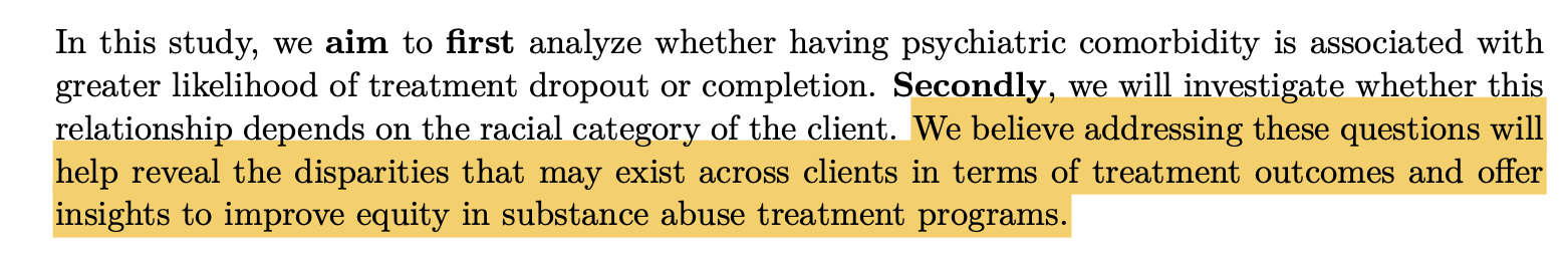 A good example : Psychiatric Comorbidity in Opioid Use Treatment Outcomes by Linda Tang (last paragraph of Introduction)